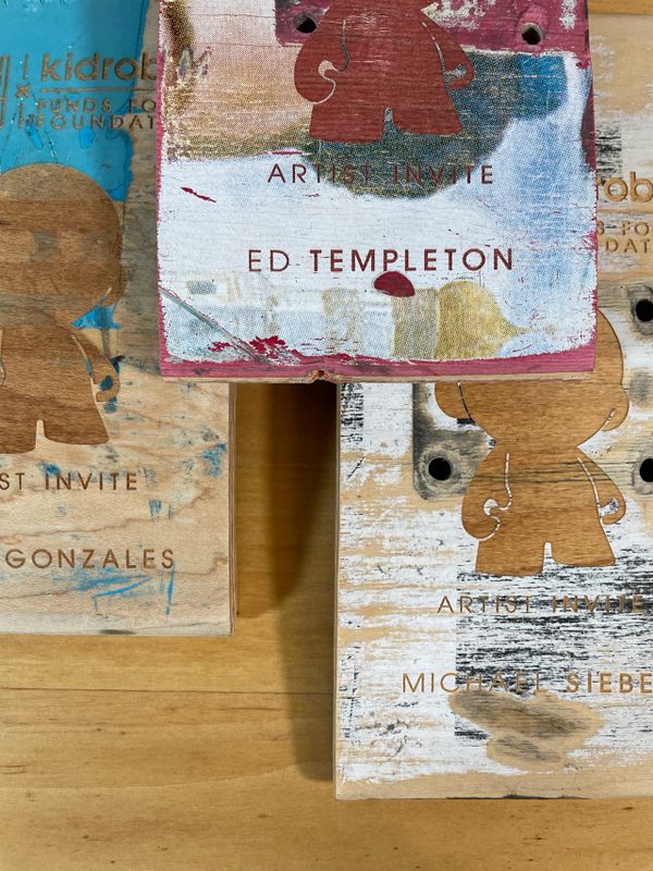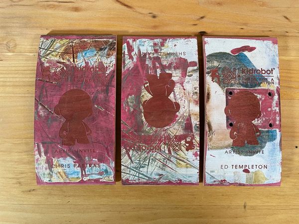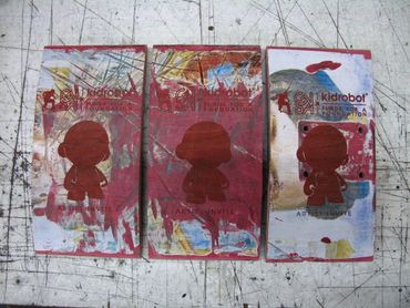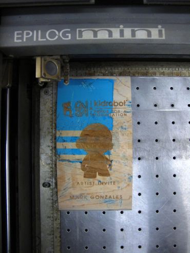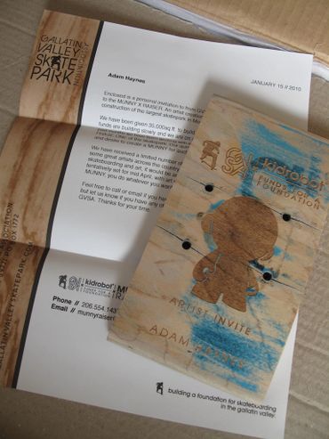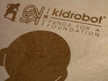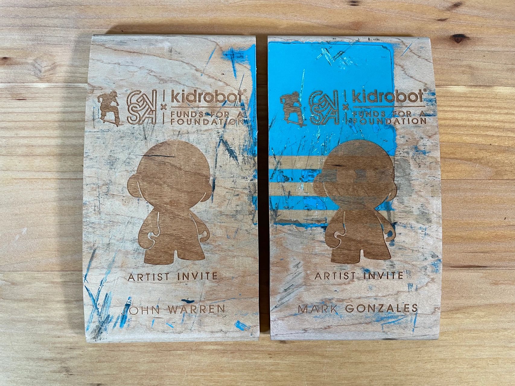 When Kidrobot shipped us over 30 Munny Figures for artists to work with and in the grand scheme of things, raise money for the skatepark by selling them online. That called for some sweet custom invites that also served as "Thanks You's". We took a handful of old decks, cut them into Wanka tickets and then got to laser down out logo lock up and each artist name individually.